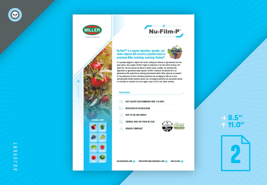 Nu-Film-P® is a superior deposition, spreader, and sticker adjuvant with non-ionic properties based on proprietary Miller technology containing Pinolene®.